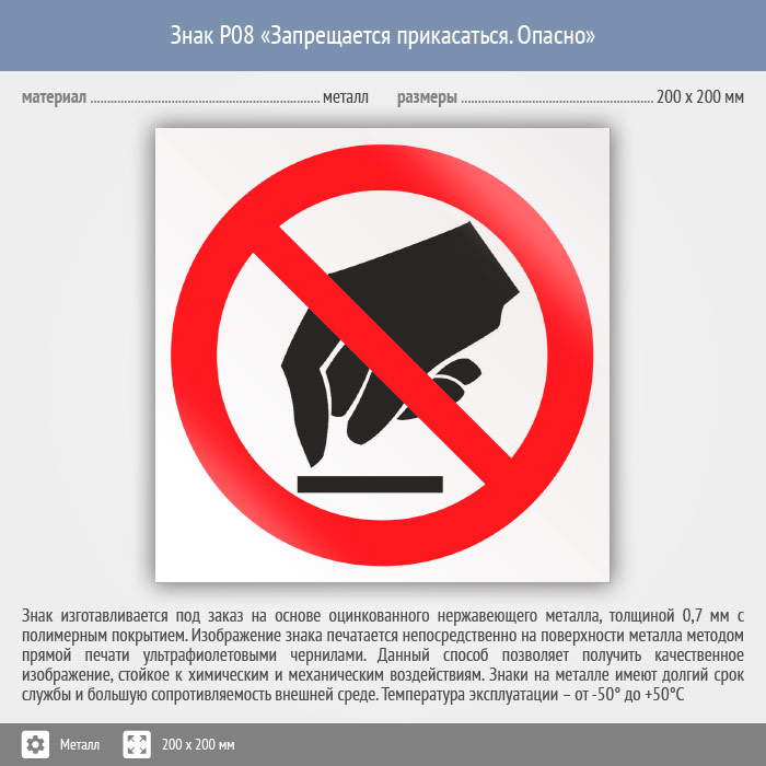 Знак P08 «Запрещается прикасаться. Опасно» (металл, 200х200 мм) в Твери купить