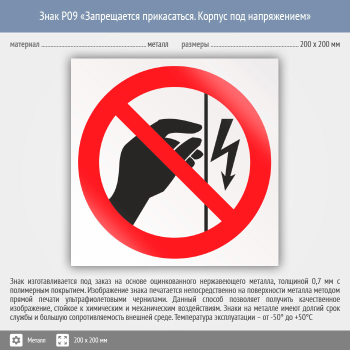 Знак P09 «Запрещается прикасаться. Корпус под напряжением» (металл, 200х200 мм) в Твери купить
