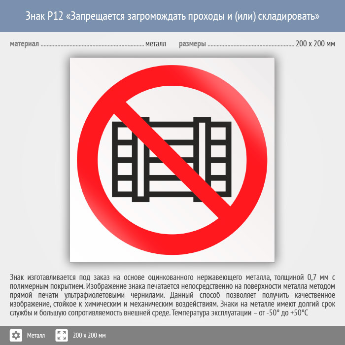 Знак P12 «Запрещается загромождать проходы и (или) складировать» (металл, 200х200 мм) в Твери купить