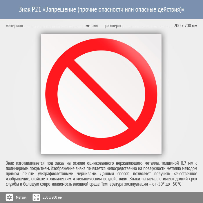 Знак P21 «запрещение (прочие опасности или опасные действия)» (металл, 200х200 мм) в Твери купить