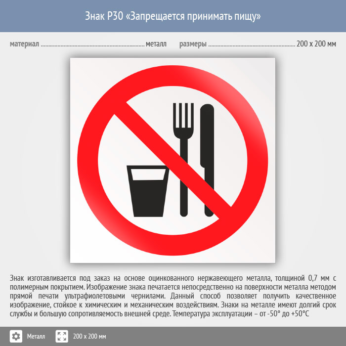 Знак P30 «Запрещается принимать пищу» (металл, 200х200 мм) в Твери купить