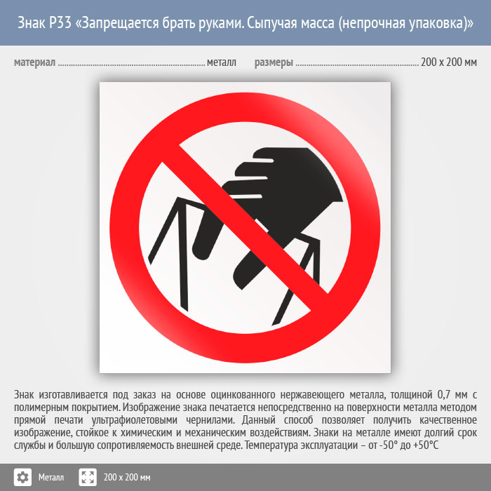 Знак P33 «Запрещается брать руками. Сыпучая масса (непрочная упаковка)» (металл, 200х200 мм) в Твери купить