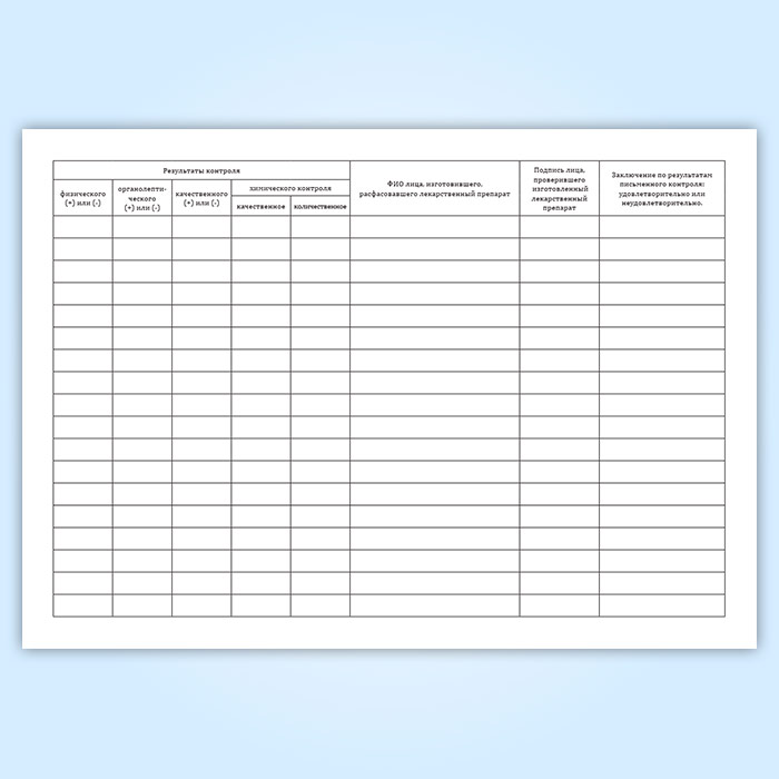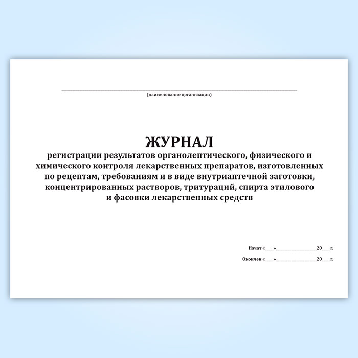 Журнал регистрации результатов органолептического, физического и химического контроля лекарственных препаратов, изготовленных по рецептам, требованиям и в виде внутриаптечной заготовки, концентрированных растворов, тритураций, спирта этилового и фасовки лекарственных средств в Твери купить