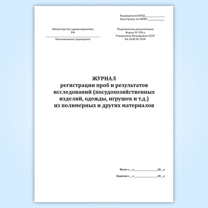 Журнал регистрации проб и результатов исследований (посудохозяйственных изделий, одежды, игрушек и т.д.) из полимерных и других материалов (форма № 338-у) в Твери купить