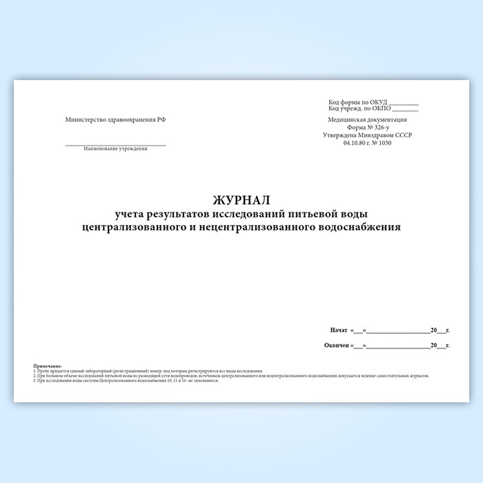 Журнал учета результатов исследований питьевой воды централизованного и нецентрализованного водоснабжения (форма 326-у) в Твери купить