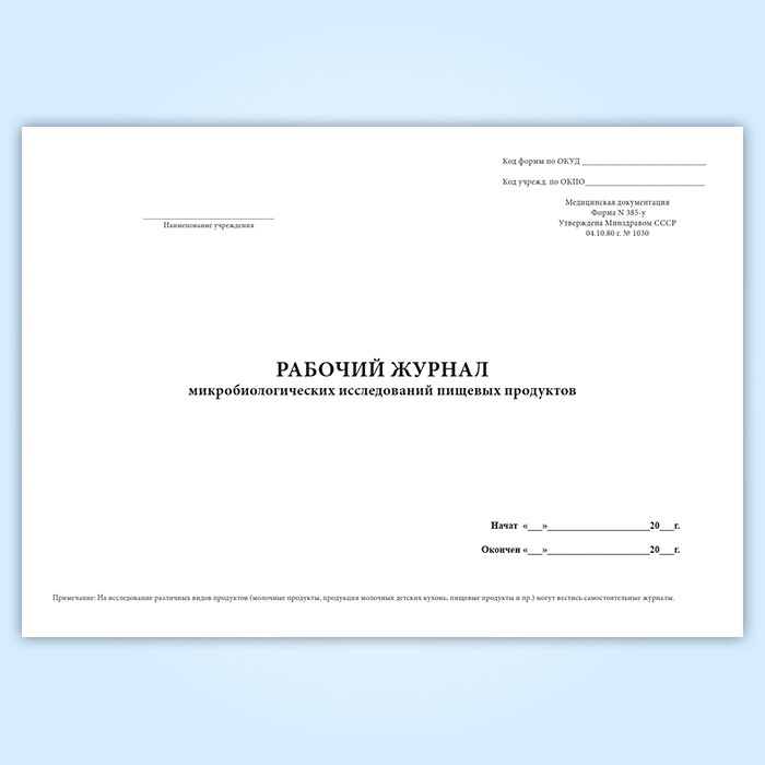 Рабочий журнал микробиологических исследований пищевых продуктов (форма 385/у) в Твери купить