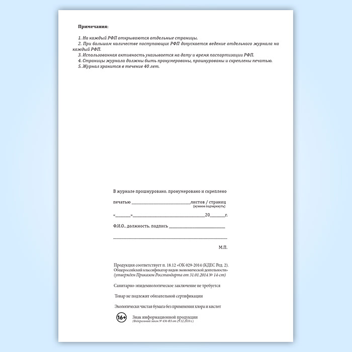 Вы получаете печатную продукцию прошнурованной и c местом для вашей печати в соответствии с действующими нормативными документами: