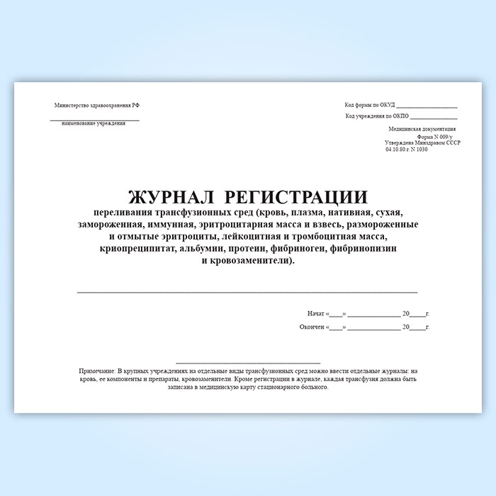Журнал регистрации переливания трансфузионных сред (форма 009/у) в Твери купить