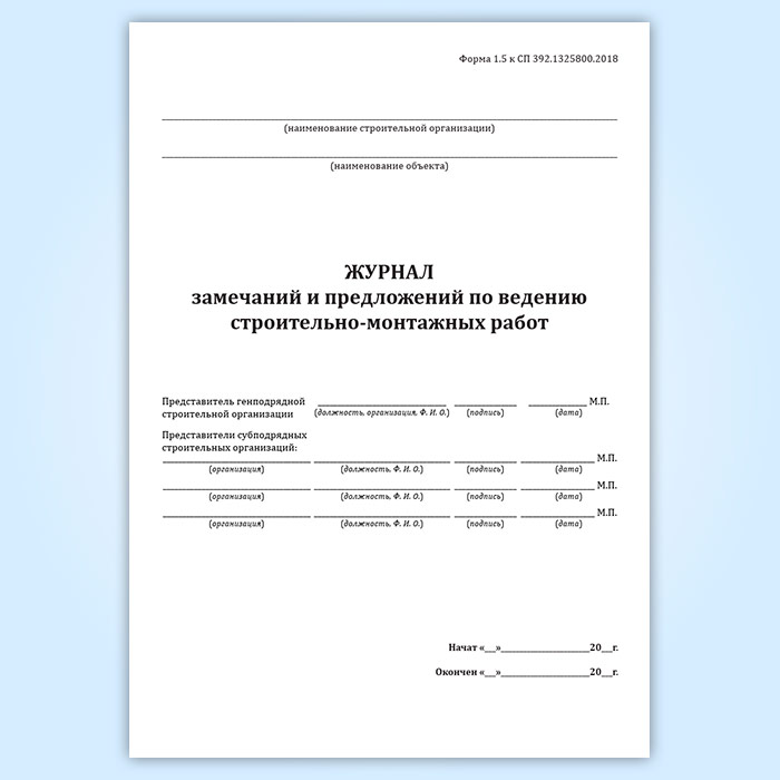 Журнал замечаний и предложений по ведению строительно-монтажных работ (форма 1.5, СП 392.1325800.2018) в Твери купить
