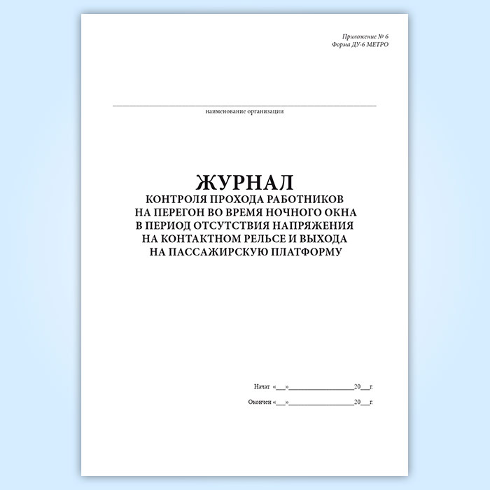 Журнал контроля прохода работников на перегон во время ночного окна в период отсутствия напряжения на контактном рельсе и выхода на пассажирскую платформу (форма ДУ-6 МЕТРО) в Твери купить