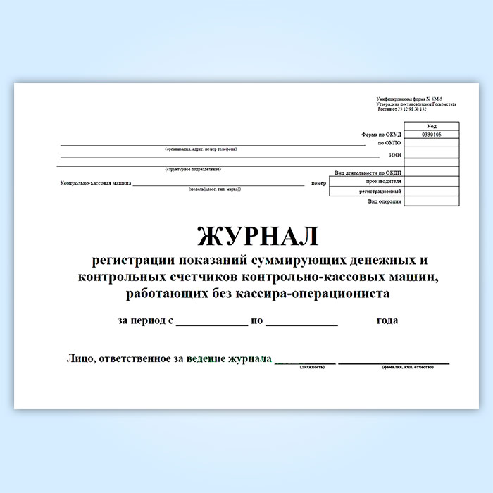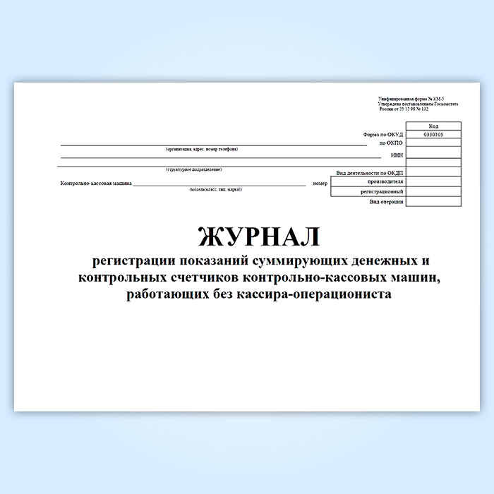 Журнал регистрации показаний суммирующих денежных и контрольных счетчиков контрольно-кассовых машин, работающих без кассира-операциониста (форма КМ-5) в Твери купить
