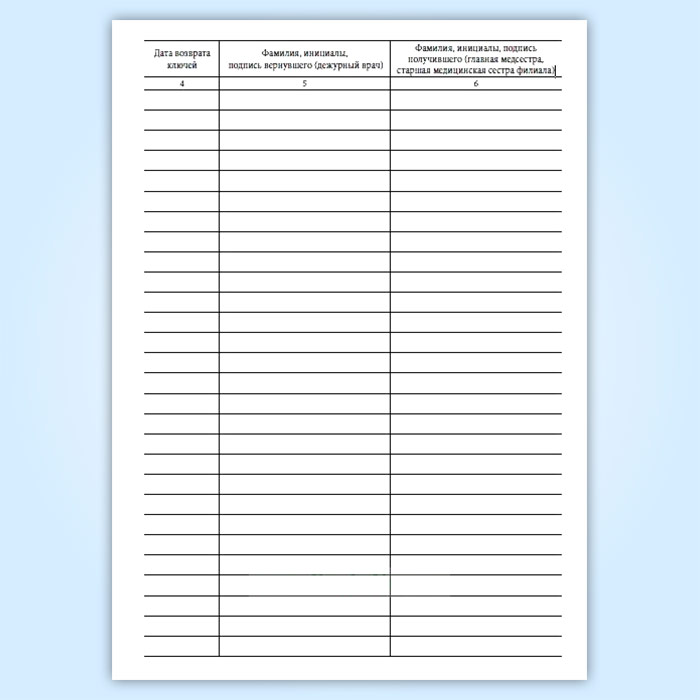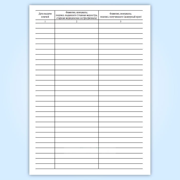 Журнал передачи ключей главной медсестры (старшей медицинской сестры филиала) дежурным врачам от помещения и сейфа, где проводятся операции, связанные с оборотом наркотических средств и психотропных веществ, в выходные и праздничные дни в амбулаторном отделении медицинской организации в Твери купить
