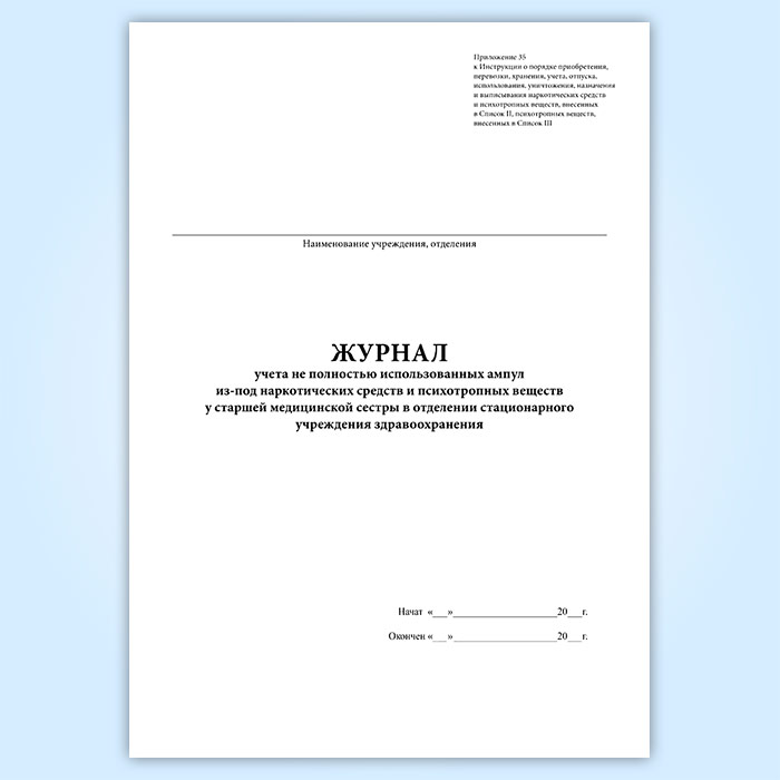 Журнал учета не полностью использованных ампул из-под наркотических средств и психотропных веществ у старшей медицинской сестры в отделении стационарного учреждения здравоохранения в Твери купить
