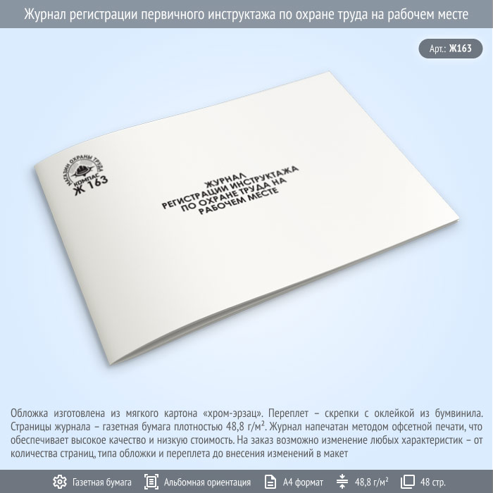 Журнал регистрации первичного инструктажа по охране труда на рабочем месте (Ж163, 48 стр.) в Твери купить