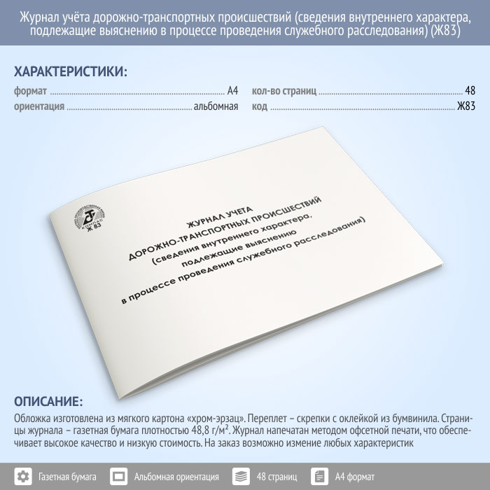 Журнал учета дорожно-транспортных происшествий (сведения внутреннего характера, подлежащие выяснению в процессе проведения служебного расследования) (48 стр., Ж83) в Твери купить