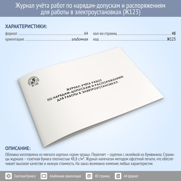 Журнал учета работ по нарядам-допускам и распоряжениям для работы в электроустановках (48 стр., Ж123) в Твери купить