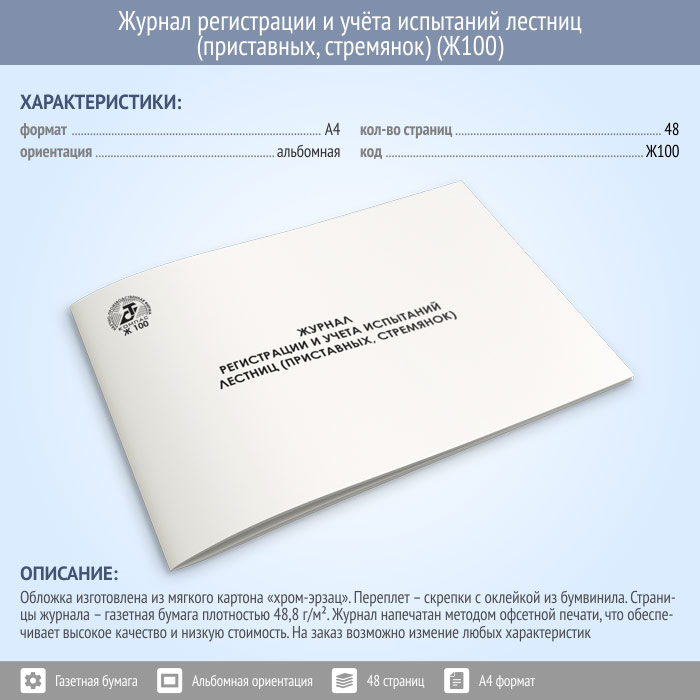 Журнал регистрации и учета испытаний лестниц (приставных, стремянок) (48 стр., Ж100) в Твери купить