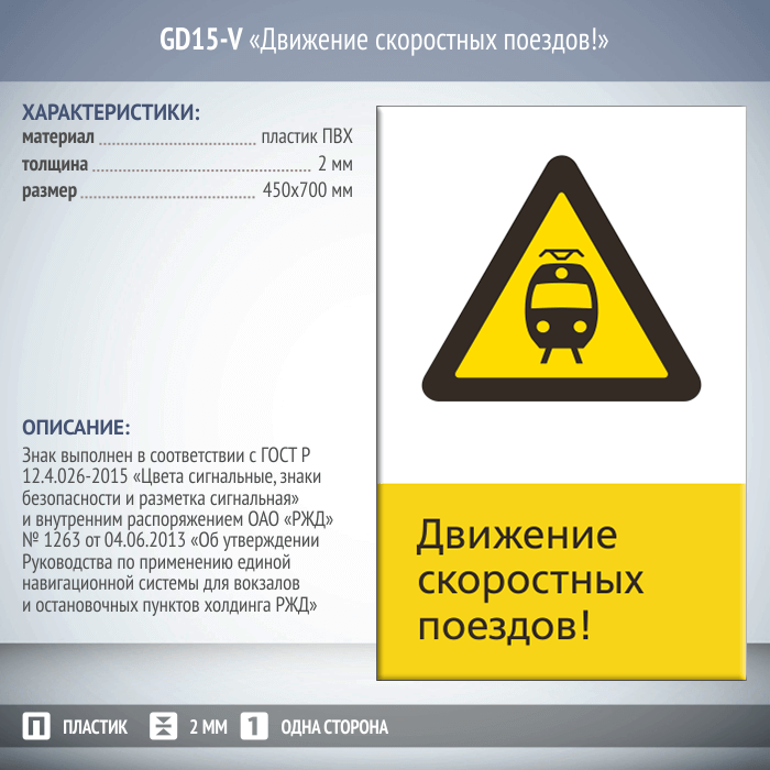 Знак безопасности «Движение скоростных поездов!» выполняется в одностороннем (металл и пластик) и двустороннем (только металл) виде, на ПВХ-пластике, толщиной 2 мм или листе оцинкованного металла, толщиной 0,8 мм. Размеры знаков - 450 мм х 700 мм (вертикальная ориентация) либо 540 мм х 220 мм (горизонтальная ориентация). Знаки изготавливаются в полном соответствии с ГОСТ Р 12.4.026-2015 «Цвета сигнальные, знаки безопасности и разметка сигнальная» и внутренним распоряжением ОАО «РЖД» № 1263 от 04.06.2013 «Об утверждении Руководства по применению единой навигационной системы для вокзалов и остановочных пунктов холдинга РЖД». По желанию заказчика возможно использование светоотражающих материалов. Так же при необходимости производим закругление углов знака