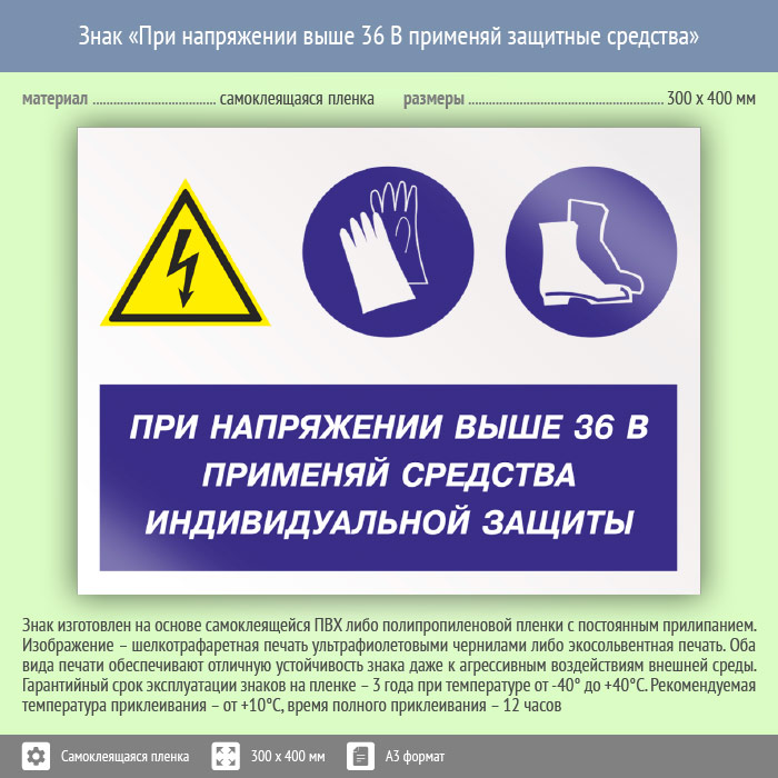 Знак «При напряжении выше 36 В применяй защитные средства» может быть изготовлен любого размера на самоклеящейся пленке, пластике толщиной 0.5, 2 или 4 мм и металле. Также возможно применение фотолюминесцентных и световозвращающих материалов