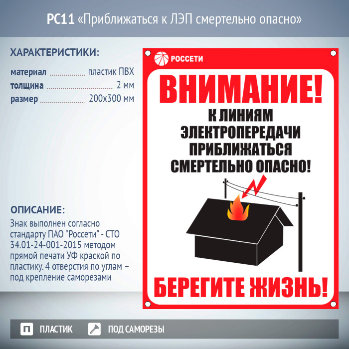 Знак «Приближаться к ЛЭП смертельно опасно», РС11 (пластик 2 мм, 200х300 мм, отверстия под саморезы)