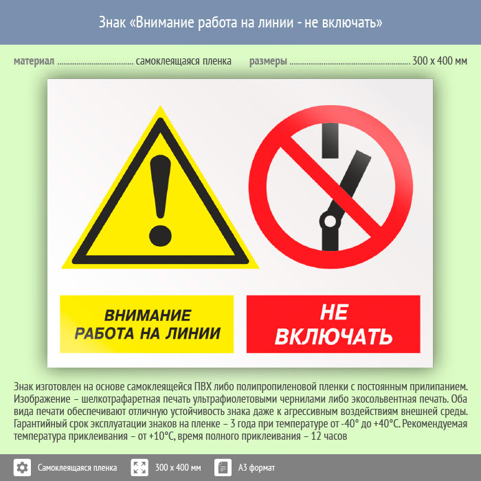 Знак «Внимание работа на линии – не включать» может быть изготовлен любого размера на самоклеящейся пленке, пластике толщиной 0.5, 2 или 4 мм и металле. Также возможно применение фотолюминесцентных и световозвращающих материалов