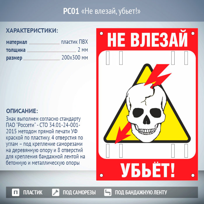 Знак «Не влезай, убьет!», РС01 (пластик 2 мм, 200х300 мм, отверстия под бандажную ленту) в Твери купить