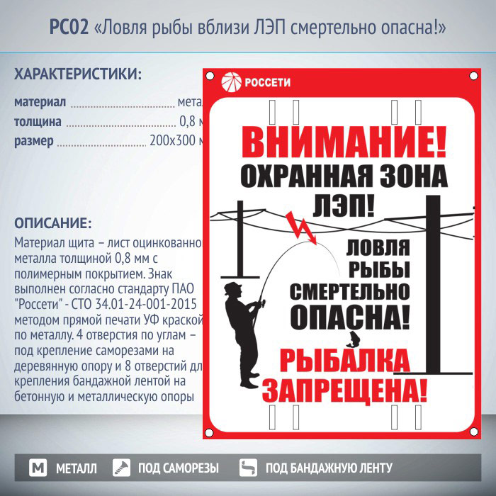 Знак «Ловля рыбы вблизи ЛЭП смертельно опасна!», РС02 (металл, 200х300 мм, отверстия под бандажную ленту) в Твери купить