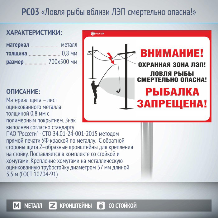 Информационный щит «Ловля рыбы вблизи ЛЭП смертельно опасна!», РС03 (металл, 700х500 мм, с металлической стойкой) в Твери купить