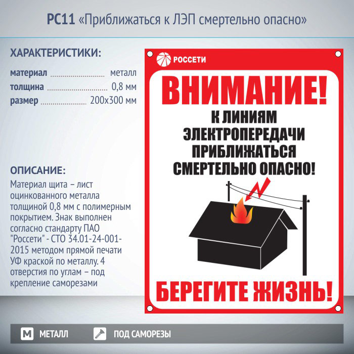 Знак «Приближаться к ЛЭП смертельно опасно», РС11 (металл, 200х300 мм, отверстия под саморезы) в Твери купить