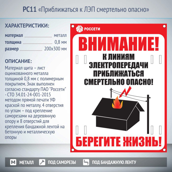 Знак «Приближаться к ЛЭП смертельно опасно», РС11 (металл, 200х300 мм, отверстия под бандажную ленту) в Твери купить