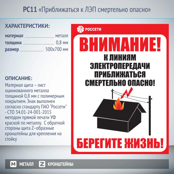 Информационный щит «Приближаться к ЛЭП смертельно опасно», РС11 (металл, 500х700 мм, кронштейны для крепления) в Твери купить