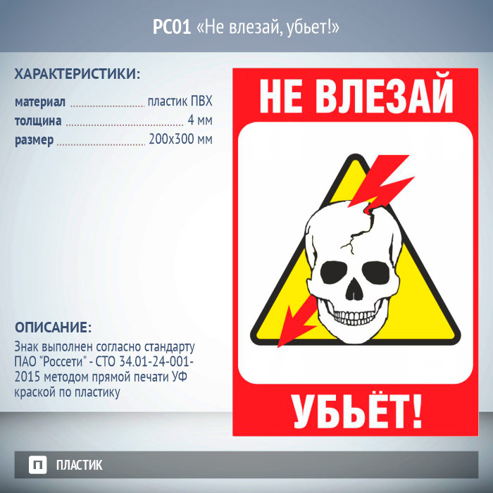 Знак «Не влезай, убьет!», РС01 (пластик 2 мм, 200х300 мм) в Твери купить