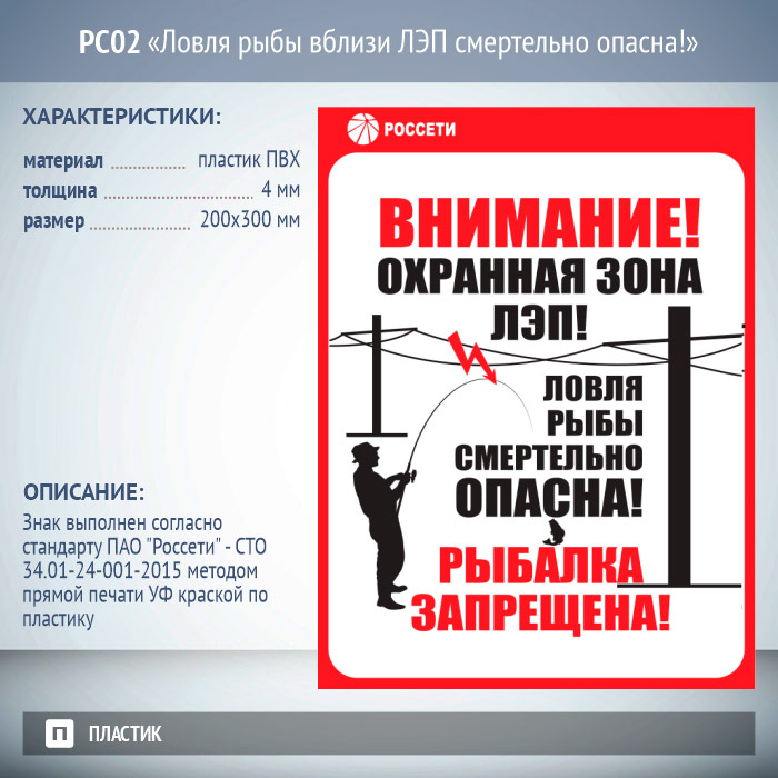 Знак «Ловля рыбы вблизи ЛЭП смертельно опасна!», РС02 (пластик 2 мм, 200х300 мм) в Твери купить
