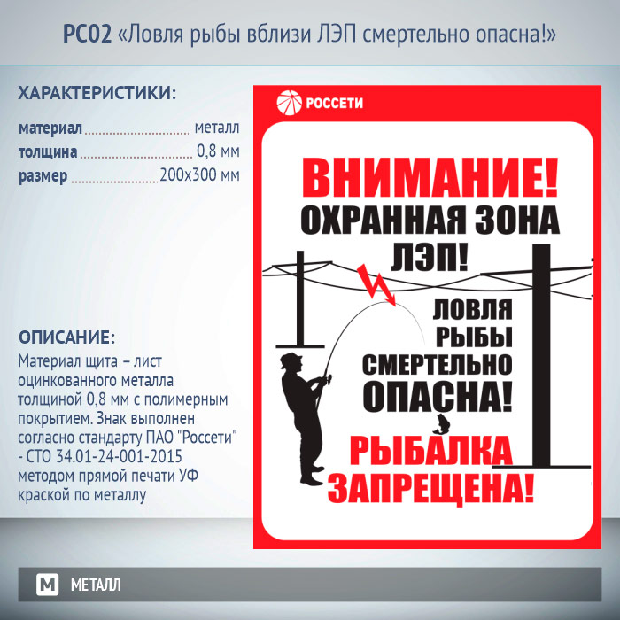 Знак «Ловля рыбы вблизи ЛЭП смертельно опасна!», РС02 (металл, 200х300 мм) в Твери купить