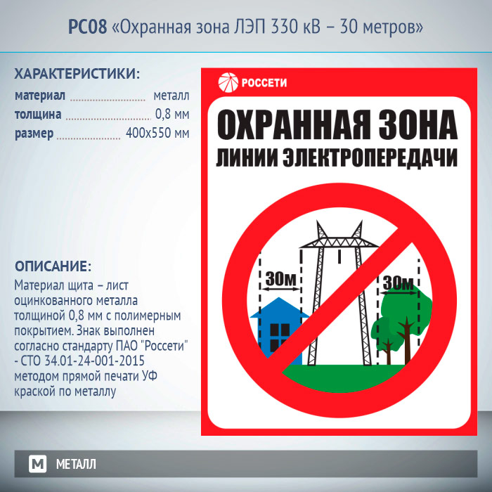 Знак «Охранная зона ЛЭП 330 кВ – 30 метров», РС08 (металл, 400х550 мм) в Твери купить