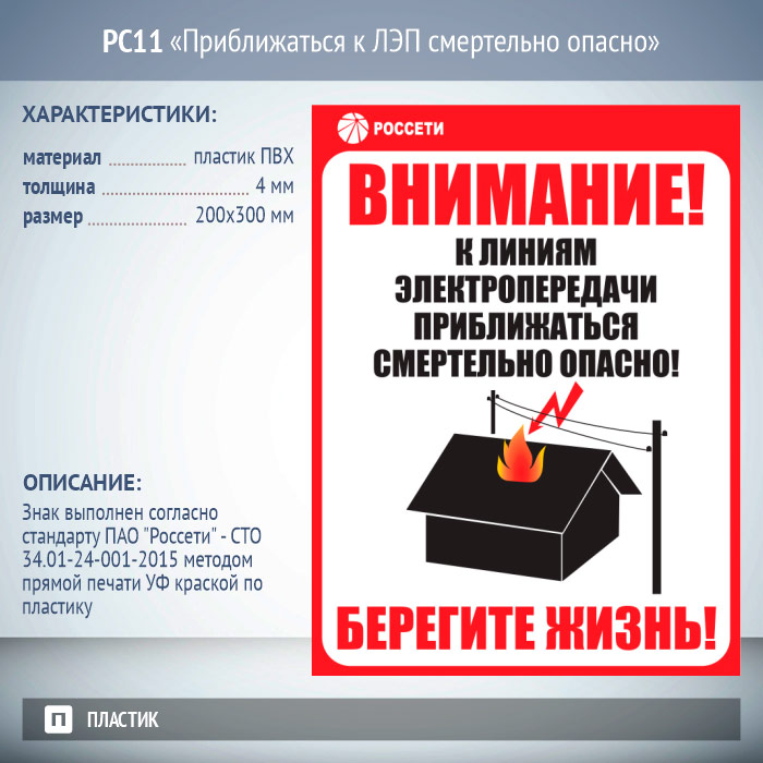 Знак «Приближаться к ЛЭП смертельно опасно», РС11 (пластик 2 мм, 200х300 мм) в Твери купить