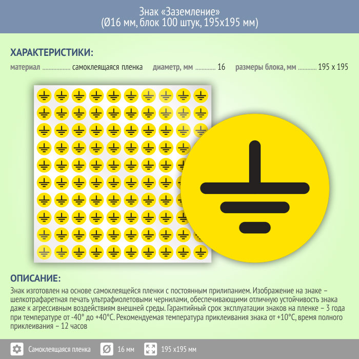 Знак (плакат) «Заземление», S46 (пленка, диаметр 16 мм, блок 100 штук, 195х195 мм) в Твери купить