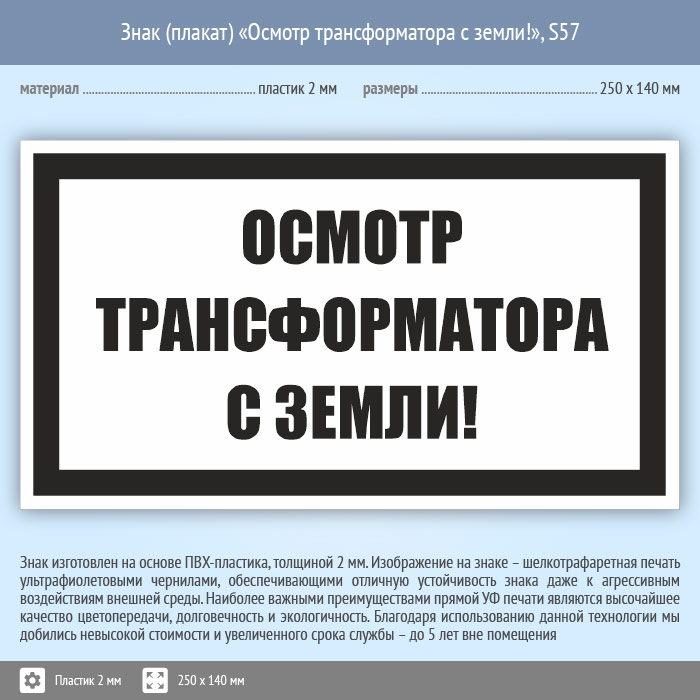 Знак (плакат) «Осмотр трансформатора с земли!», S57 (пластик, 250х140 мм) в Твери купить