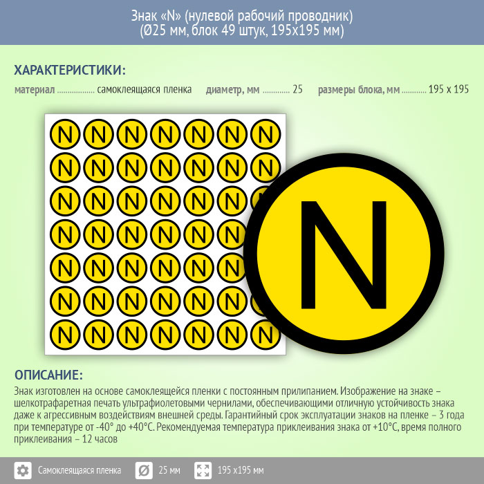 Знак (плакат) «N» (нулевой рабочий проводник), S47 (пленка, диаметр 25 мм, блок 49 штук, 195х195 мм) в Твери купить