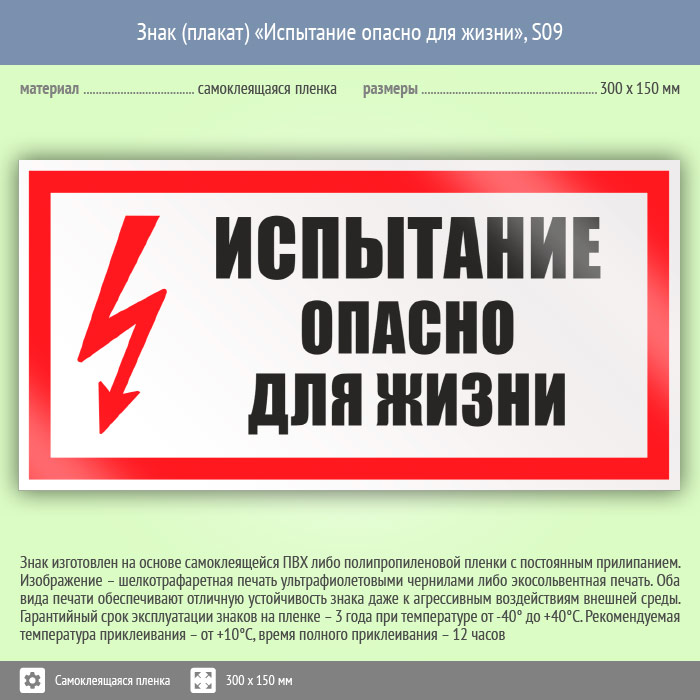 Знак (плакат) «Испытание опасно для жизни», S09 (пленка, 300х150 мм) в Твери купить