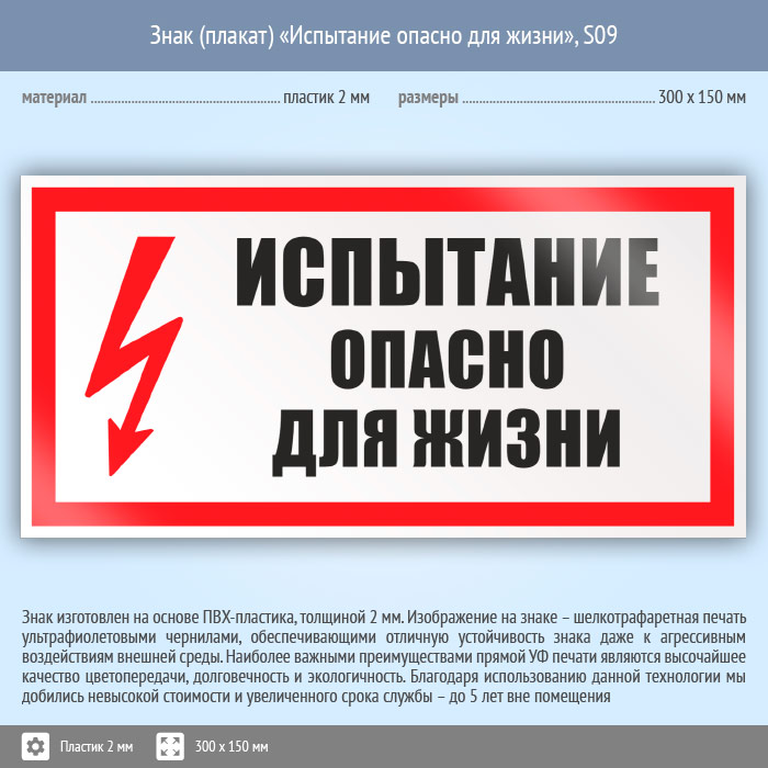 Знак (плакат) «Испытание опасно для жизни», S09 (пластик, 300х150 мм) в Твери купить