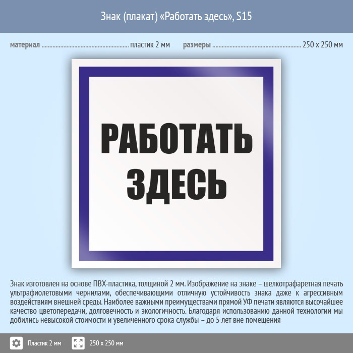 Знак (плакат) «Работать здесь», S15 (пластик, 250х250 мм) в Твери купить