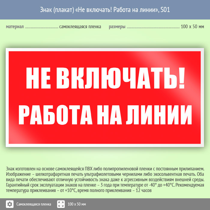 Знак (плакат) «Не включать! Работа на линии», S01 (пленка, 100х50 мм) в Твери купить