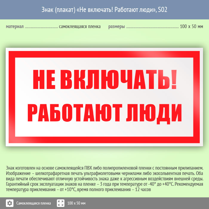 Знак (плакат) «Не включать! Работают люди», S02 (пленка, 100х50 мм) в Твери купить