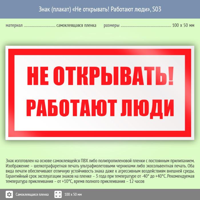 Знак (плакат) «Не открывать! Работают люди», S03 (пленка, 100х50 мм) в Твери купить