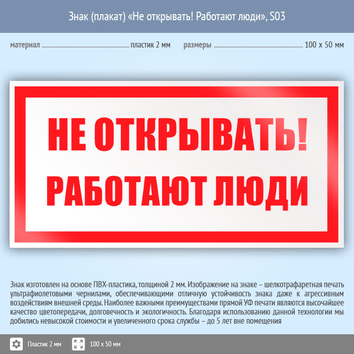 Знак (плакат) «Не открывать! Работают люди», S03 (пластик, 100х50 мм) в Твери купить