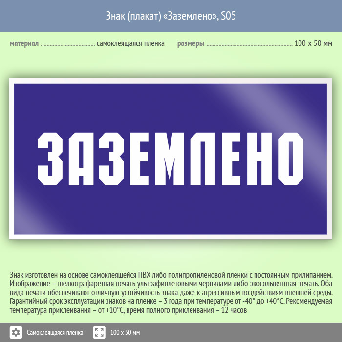 Знак (плакат) «Заземлено», S05 (пленка, 100х50 мм) в Твери купить