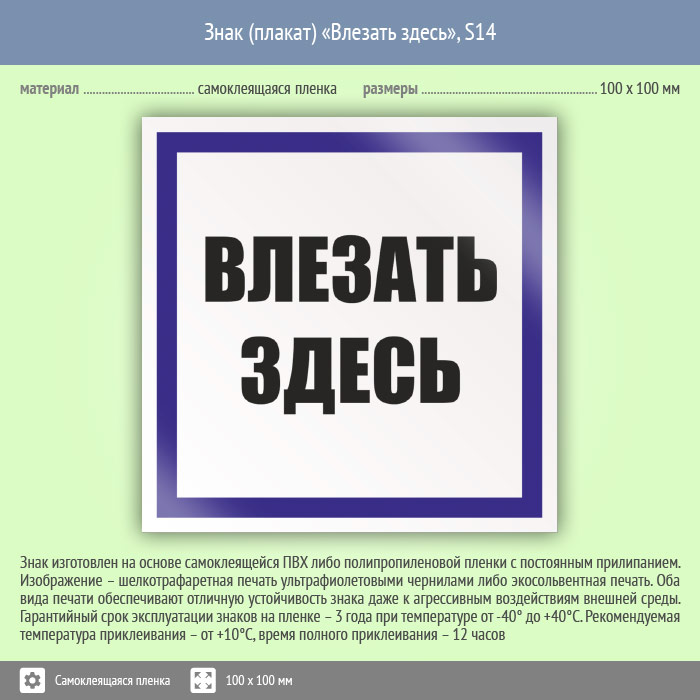 Знак (плакат) «Влезать здесь», S14 (пленка, 100х100 мм) в Твери купить