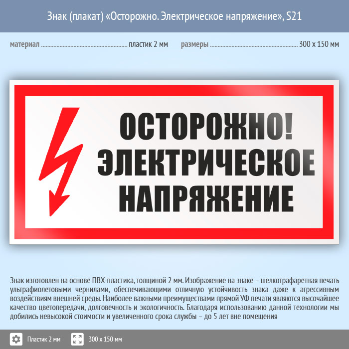 Знак (плакат) «Осторожно. Электрическое напряжение», S21 (пластик, 300х150 мм) в Твери купить