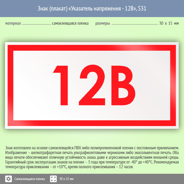 Знак (плакат) «Указатель напряжения 12 В», S31 (50 штук, пленка, 30х15 мм) в Твери купить